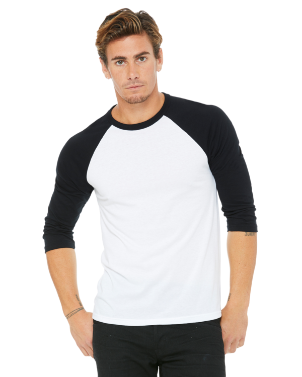 Features: Contrast raglan sleeves and neck trim. Side-seamed. Retail fit. Unisex sizing.